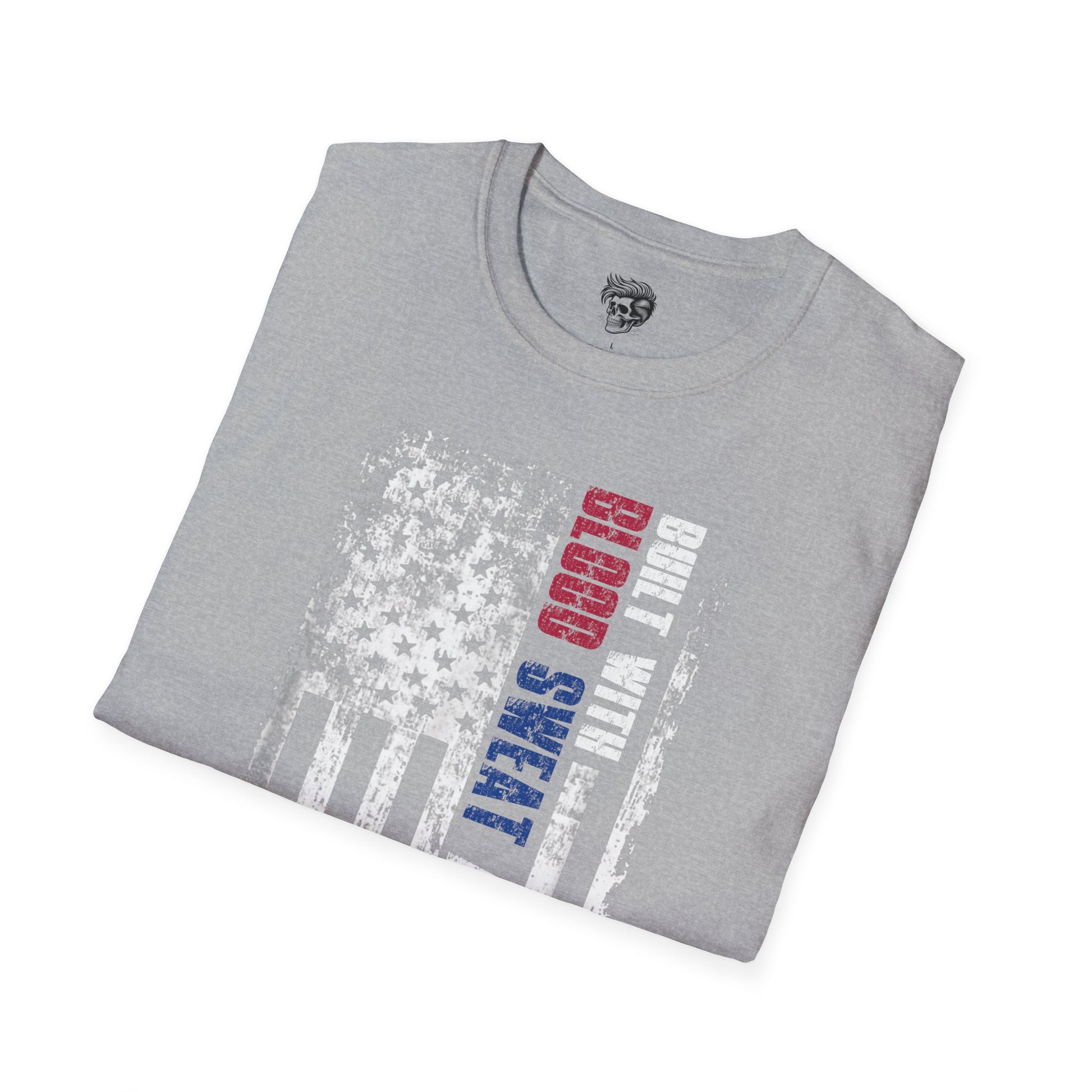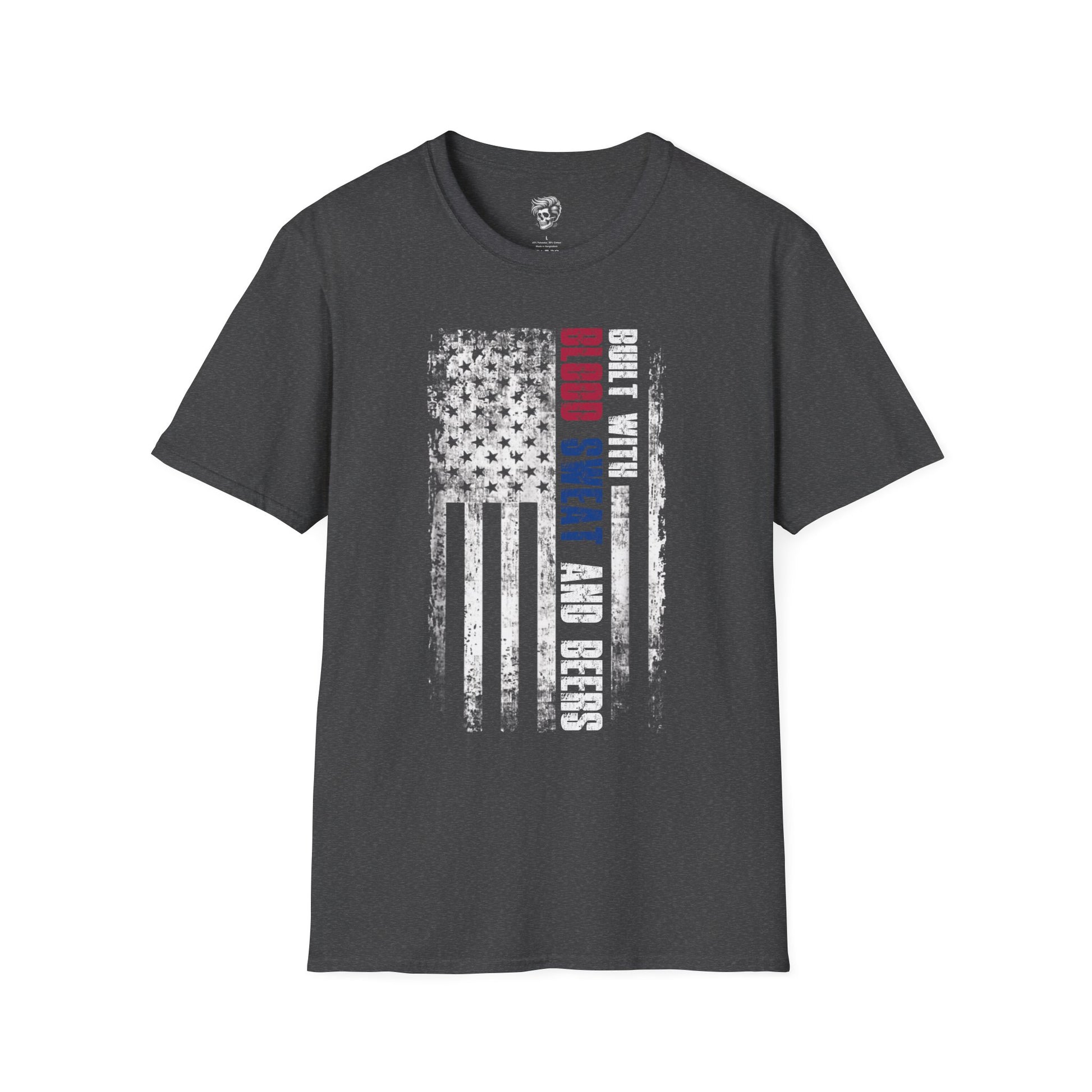 This one’s for the hard-working Americans who know that nothing great comes easy — it’s built with blood, sweat, and beers. Featuring a rugged, distressed U.S. flag design with bold red, white, and blue accents, this shirt proudly represents the grind, grit, and good times that fuel the working class.